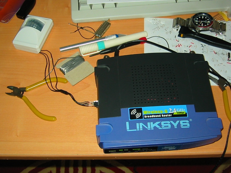 I then did the soldering part, as can be seen on the two following pictures, and closed back the Linksys case (with a simple 3 pins connector added to its side, going to the sensor, for power supply and the switch-like output)