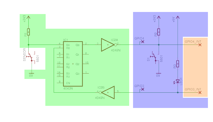 Since I didn't want to do massive polling, I decided to put an RS latch between the sensor and the motion detector. It ended up looking like this: